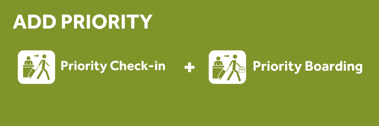 Disclaimer: Purchase of Priority service does not guarantee first check-in or first boarding. Priority services are subject to airport regulations, security requirements, and operational conditions at the airport.